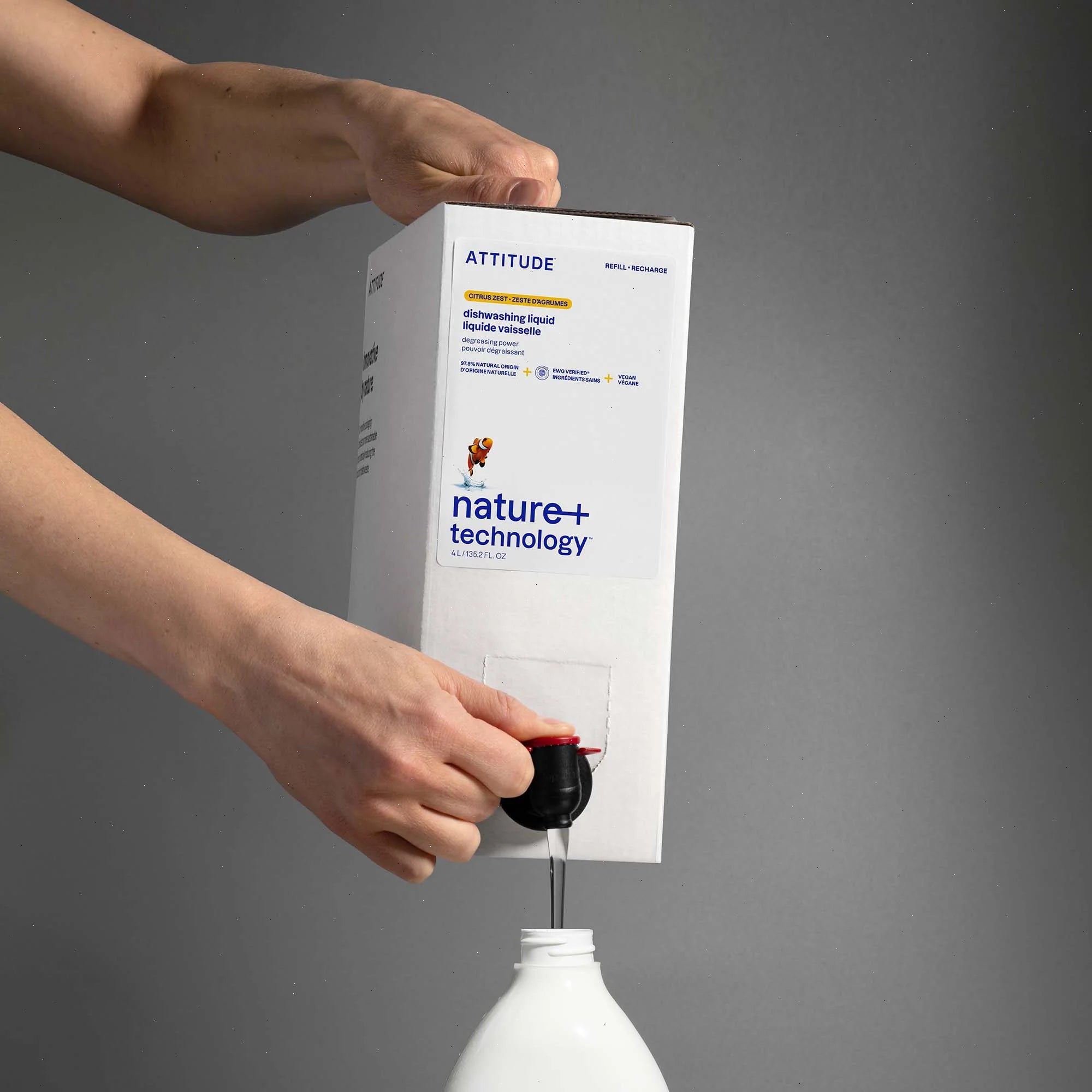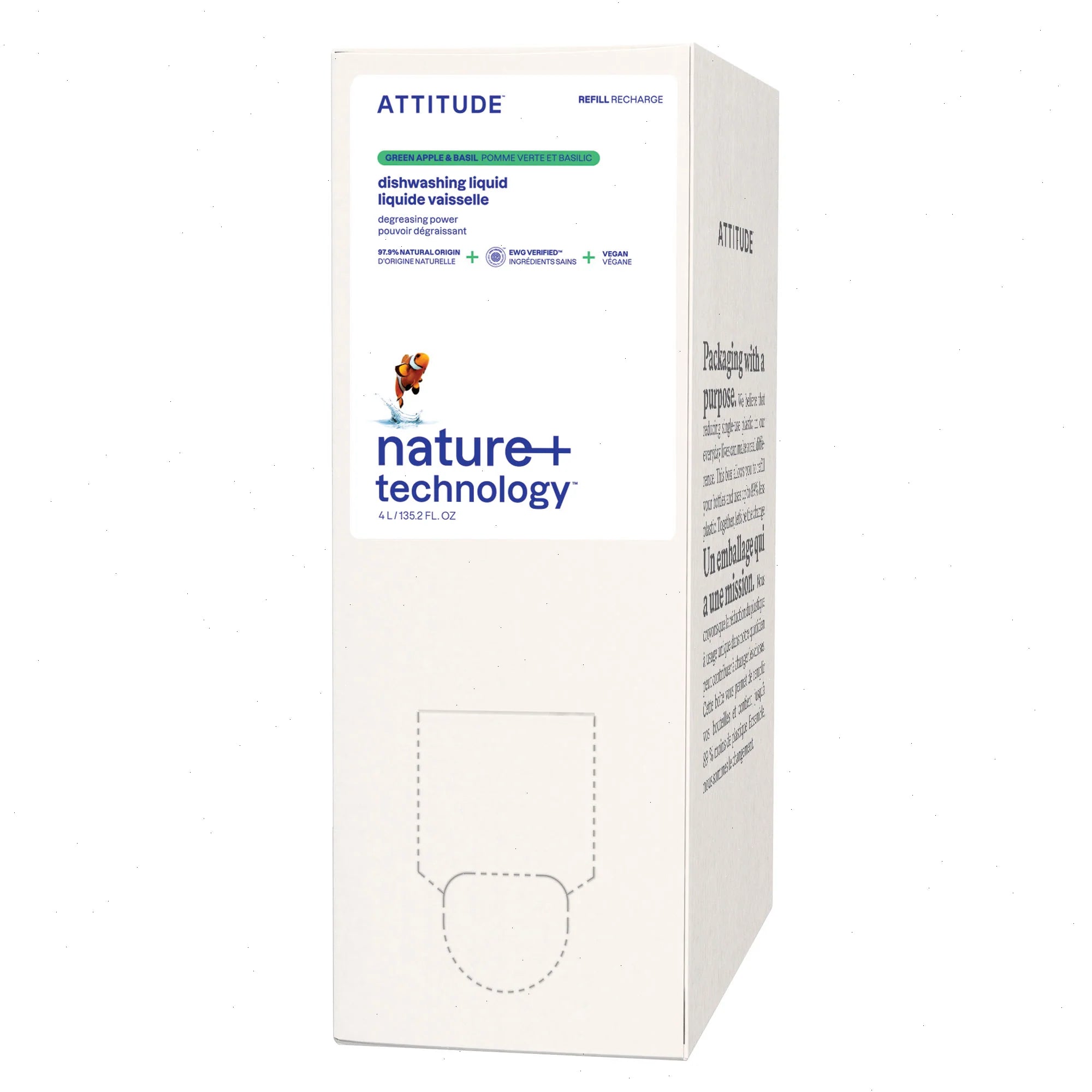 Formulated with 97% naturally derived ingredients, ATTITUDE™ dishwashing liquid with strong degreasing power is your new home essential. Let its fruity and tangy aromas transport you to an orchard with strong herbaceous notes for a fresh and unique experience. Its formula is vegan. This dishwashing liquid is offered in a 4 L eco-refill format that’s practical to use at home.